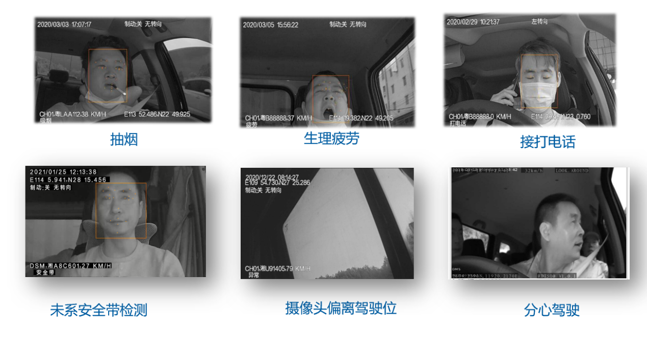 實時檢測疲勞駕駛(如閉眼、低頭打盹)、打電話、雙手脫離方向盤、不系安全帶等危險行為;