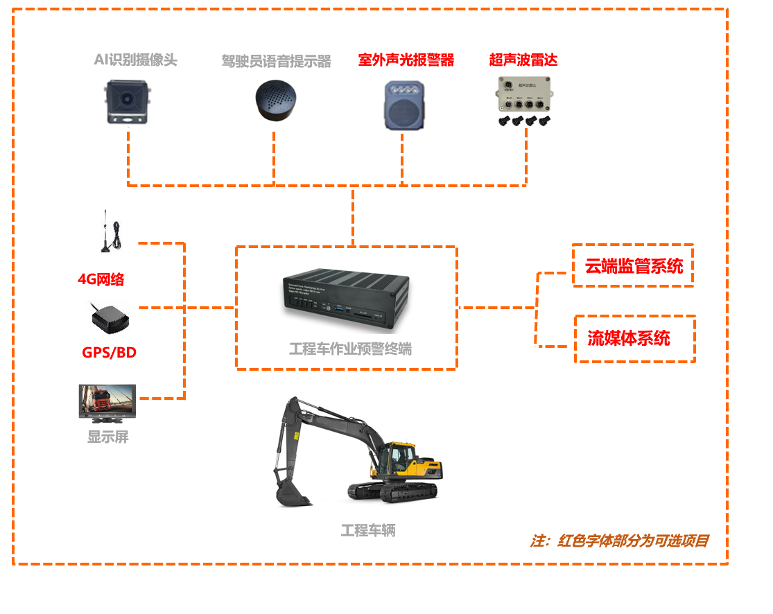 三、升級方向:車聯網時代的多系統協同防控隨著車聯網技術發展,工程車安全防護已從 “單一視覺強化” 邁向 “多系統協同”,通過多維度風險監測與主動干預,進一步提升安全性,關鍵補充系統包括:異常駕駛行為監測預警:通過攝像頭與傳感器,識別駕駛員疲勞駕駛、接打電話、未系安全帶等行為,及時提醒糾正;前方碰撞預警:實時監測本車與前方車輛、障礙物的距離,當存在碰撞風險時提前預警,為制動預留時間;車道偏離預警:針對工程車在道路行駛階段,監測車輛是否偏離車道,避免因操作失誤引發側向碰撞;緊急制動系統:在預警后駕駛員未及時響應的情況下,系統可觸發緊急制動,主動干預避免事故發生。