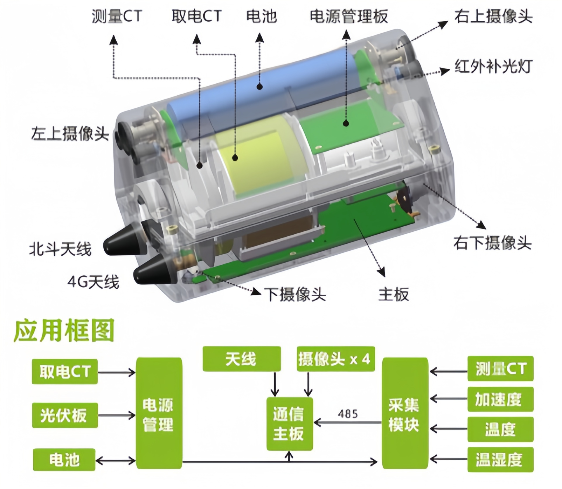 凱銘諾輸電線路覆冰在線監測裝置的硬件設計,圍繞“全覆蓋捕捉導線覆冰形態”展開,重要硬件模塊可分為視覺采集單元、能源供給單元、數據處理與傳輸單元三大類。