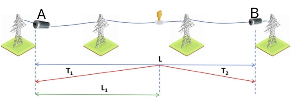 當線路發(fā)生故障時,故障點會同時產(chǎn)生兩個方向的行波:一個向線路的 A 端變電站傳播,另一個向 B 端變電站傳播。在 A 端和 B 端的監(jiān)測設(shè)備(通常是故障錄波器或特用行波測距裝置),會分別記錄下 “接收到故障行波的時間”,我們把這兩個時間分別稱為 T1和 T2。