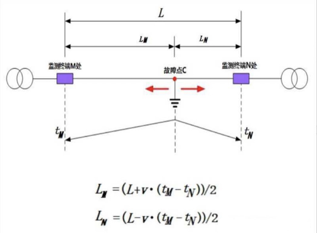 故障點(diǎn)產(chǎn)生突變電壓,引發(fā)行波(電磁波)沿導(dǎo)線向兩端傳輸(速度接近光速)。裝置通過(guò)捕捉行波傳輸時(shí)間差,結(jié)合公式精確定位故障點(diǎn)。