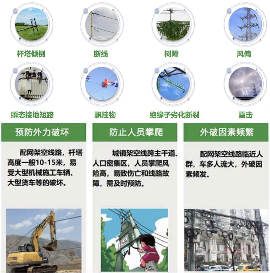 自然因素(樹(shù)障、雷擊)、外力破壞(施工碰撞、飄掛物)、設(shè)備老化(絕緣子劣化)等隱患難以及時(shí)發(fā)現(xiàn)。