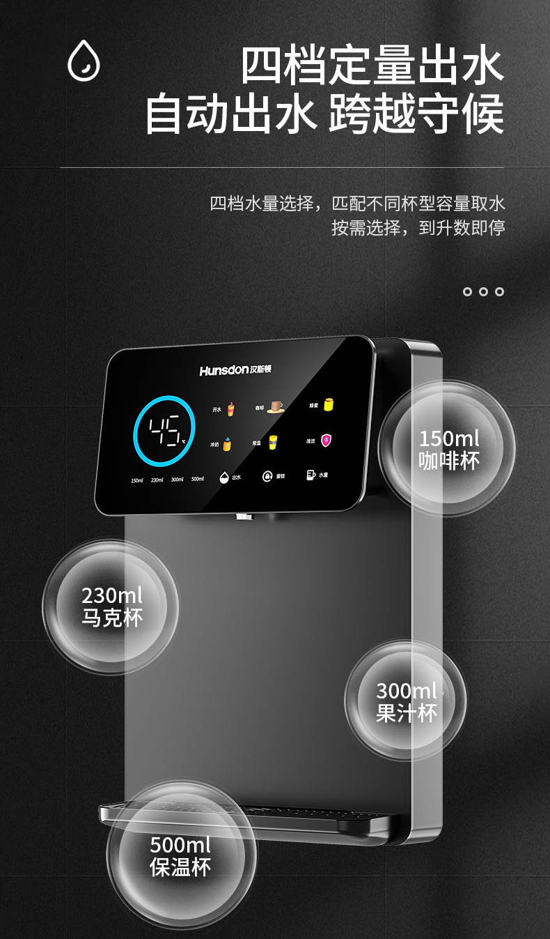 全溫域精細(xì)調(diào)控 配備智能觸控屏,支持25℃、45℃、65℃、85℃、100℃五檔溫度調(diào)節(jié),選擇專屬問題,尤其是沖奶溫度,不用擔(dān)心水太熱,進(jìn)準(zhǔn)控溫,轉(zhuǎn)為寶媽寶爸設(shè)計(jì)的需要。半夜沖奶粉不會(huì)手忙腳亂!大屏幕設(shè)計(jì),操作簡(jiǎn)單,看屏幕選擇溫度檔,老人用也放心。設(shè)定四個(gè)固定出水量 根據(jù)我們習(xí)慣用的杯子容量,設(shè)定了四個(gè)出水量:150ml、230ml、300ml和500ml。