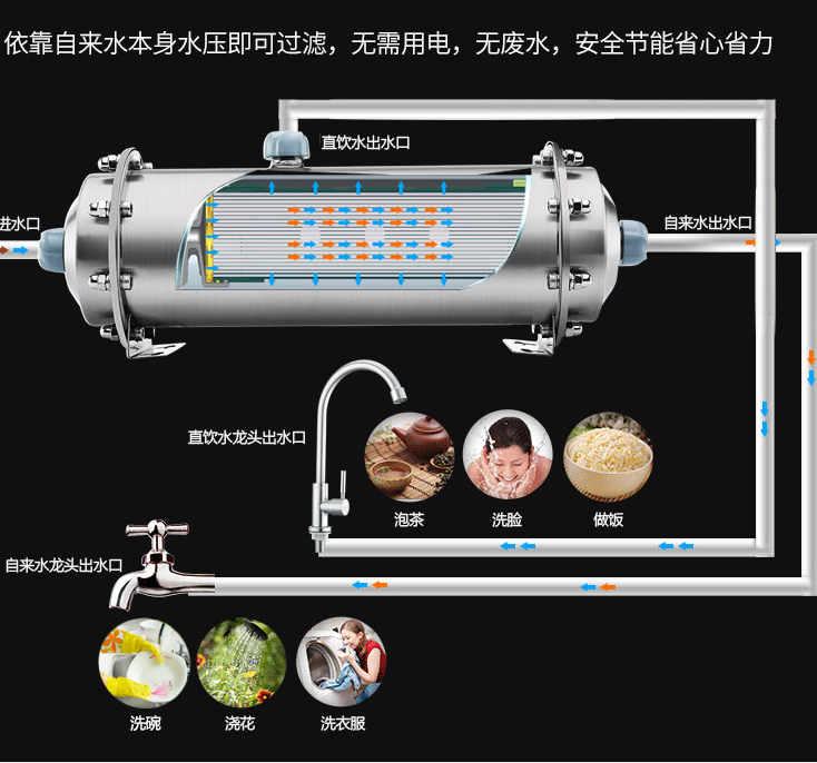 超濾凈水器的過濾精度是0.01微米,過濾效果次于反滲透凈水器,適合廚房?jī)羲枰奖慵彝ハ床撕妥鲲埵褂茫苡行н^濾自來水中微小的污染,但重金屬無能為力。如果家中水質(zhì)污染不嚴(yán)重,選擇這款超濾凈水器就足夠了,而且超濾凈水器不用插電,也不會(huì)排廢水,是不錯(cuò)的一個(gè)選擇。